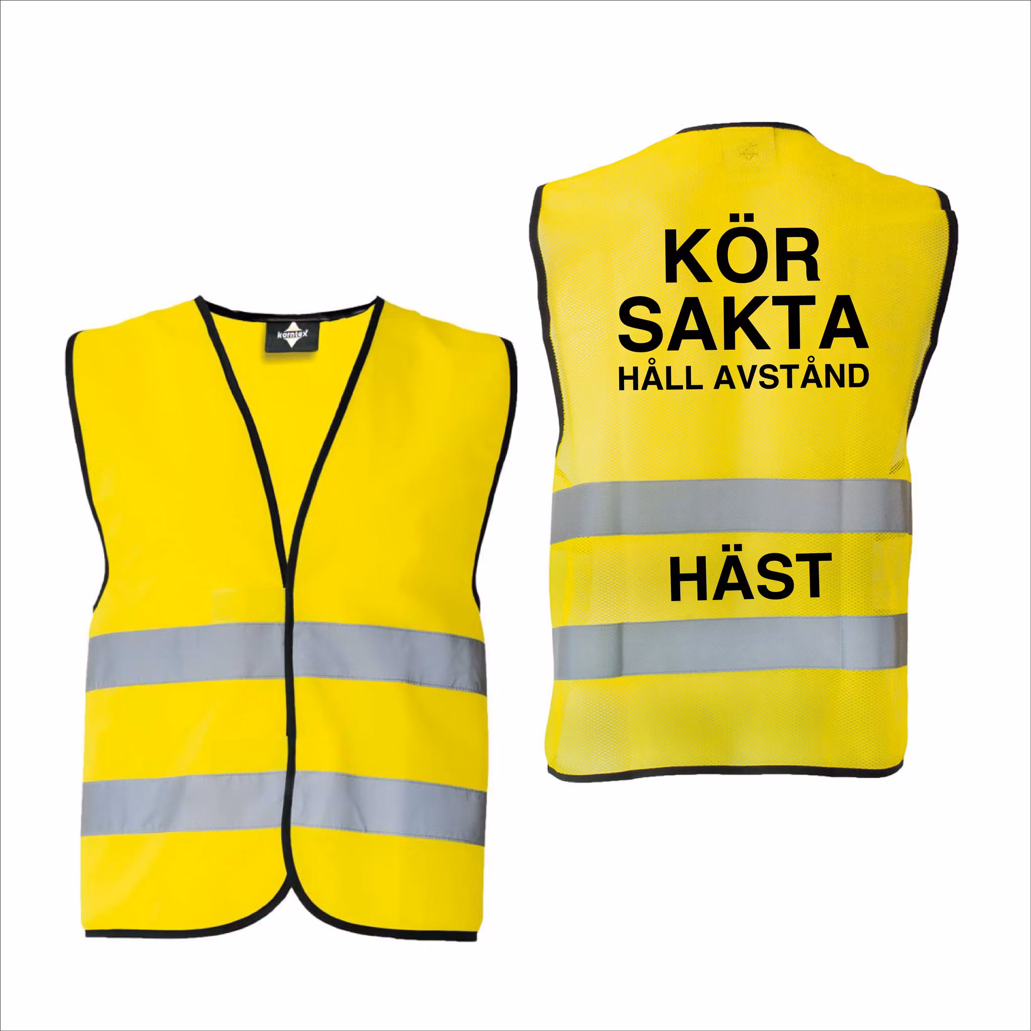 Varselväst/signalväst med tryck på ryggen med två 5 cm breda reflexband runt kropp för bättre synlighet.