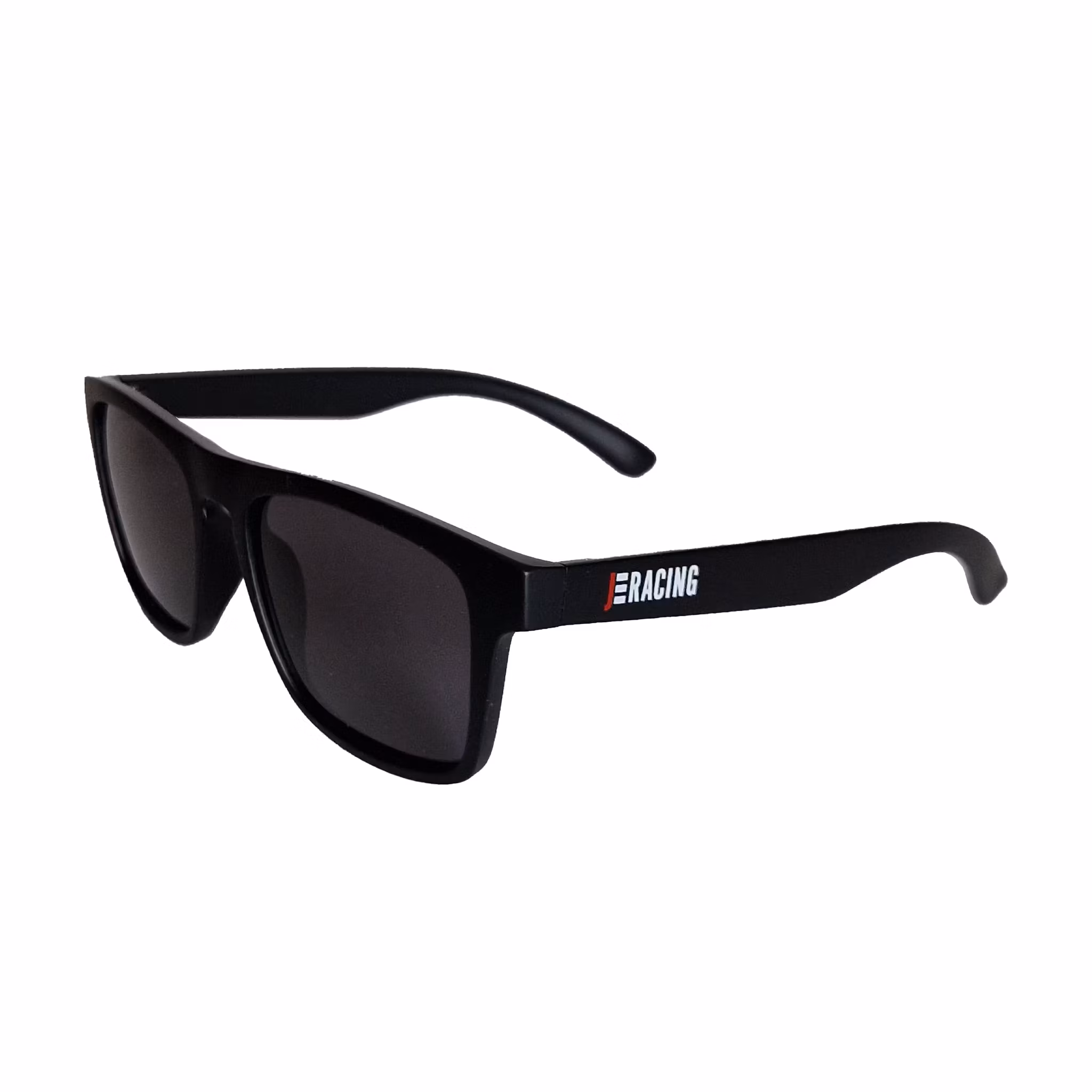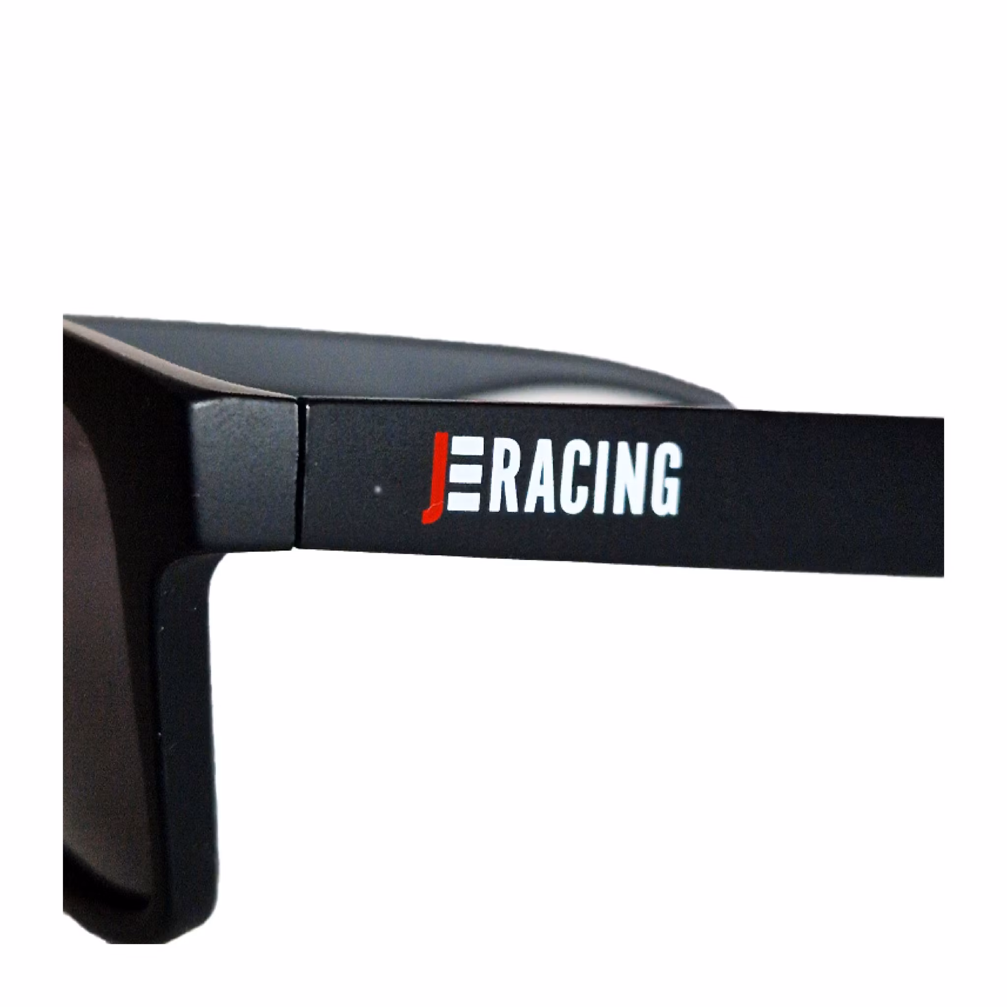Mattsvarta med svart lins och JE racing logga på båda sidor